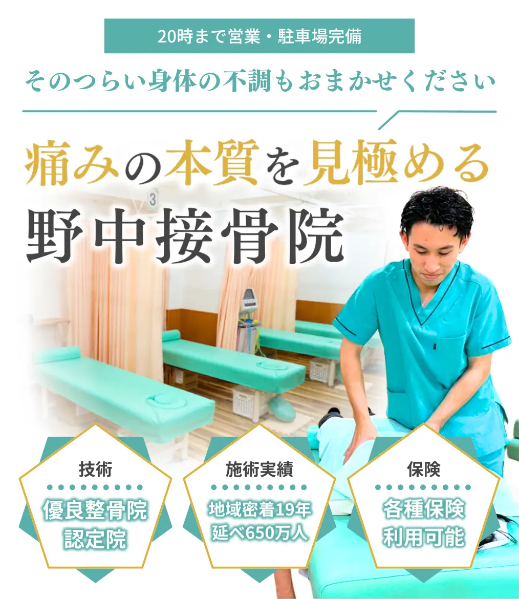 院名 野中接骨院/鍼灸院 所在地 〒202-0003 東京都西東京市北町2-3-8 電話番号 042-439-3569 営業時間 月〜金 8:00〜12:00 / 15:00〜20:00 土日祝 9:00〜18:00 駐車場 あり/9台 Googleマップ